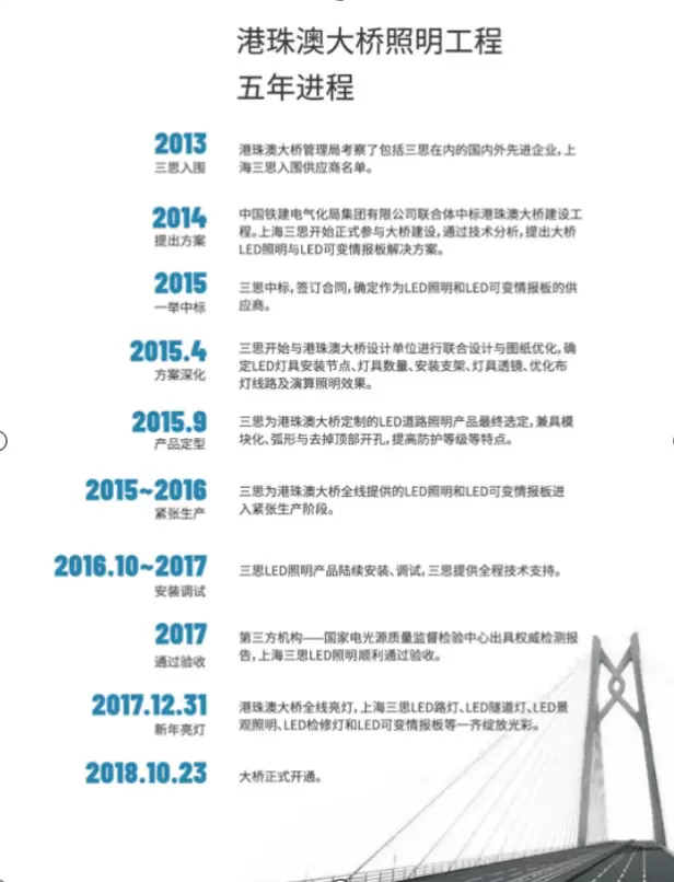 2013年初,港珠澳大桥管理局考察了包括三思在内的近百家国内外先进企业,几乎囊括了全球所有知名照明品牌。经过多轮竞标,上海三思最终凭借综合实力以及综合解决方案能力,从所有投标企业中脱颖而出,一举中标。