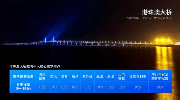 上海三思副董事长陈鸣指出,“这不是一般的道路桥梁照明”“港珠澳大桥项目对照明要求之高超出一般人的想象。它最大的挑战在于极限自然条件。”陈鸣指出了该项目最大的难点。大桥主管和建设单位给出了大桥需要考量的十大自然因素——考核指标均以十分制计,每一项都必须达标。