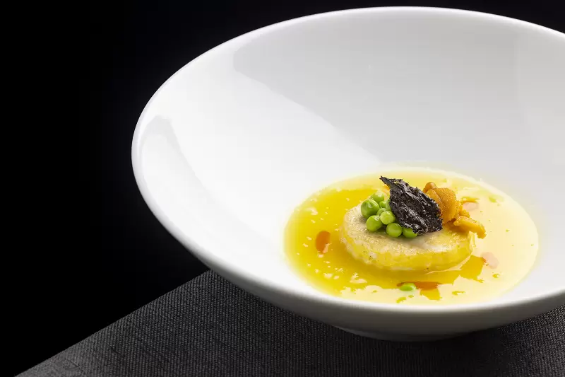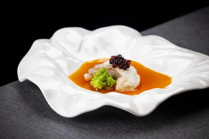 苏东坡对茶的钟情举世皆知,诚如他于《寄周安孺茶》中写道:“茶实嘉木英,其香乃天育”。青岛钓鱼台酒店与青岛美高梅酒店御苑厨师长林宝玉精选崂山绿茶与崂山豆腐,佐以青岛特产海胆,先将豆腐煎至金黄,再以钓鱼台清鸡汤煨至入味,最终呈现出一道色泽金黄、口感细腻、茶香四溢的佳肴:「崂山绿茶海胆锅塌豆腐」。入口的瞬间,浓郁的鸡汤、海胆的鲜美,伴随着豆腐的嫩滑在口腔中层层渐开,令人回味无穷。通过茶的现代诠释,赞美苏东坡始终保持豁达与乐观的心态和高洁品质,同时也是对传统鲁菜的一次味觉革新。