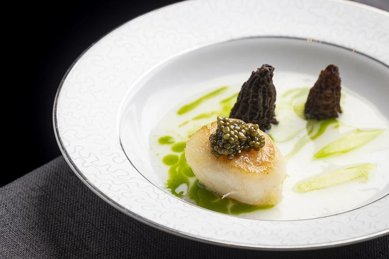 上海西岸美高梅酒店与苏东坡跨越时空的对话,由中餐行政总厨黎敏刚倾情呈现。黎师傅是拥有30年烹饪经验的香港名厨,他以《江城子·江景》为灵感,创制出「翡翠芙蓉帆立贝」。精选羊肚菌来塑造高耸的山峰,帆立贝宛如一帆小舟,芦笋与菠菜汁则被用来描绘江面泛起的涟漪,亦是荡漾在山间水际的乐曲,仿佛江水轻吟。食材本身的形态、颜色与质地生动还原了这首词所表达的意境,整道菜品颜色素雅但口感鲜香,保留了食材的自然之味,也诠释了苏东坡这首词所构建的情景和给予诗外之人想象的空间及无穷的韵味。