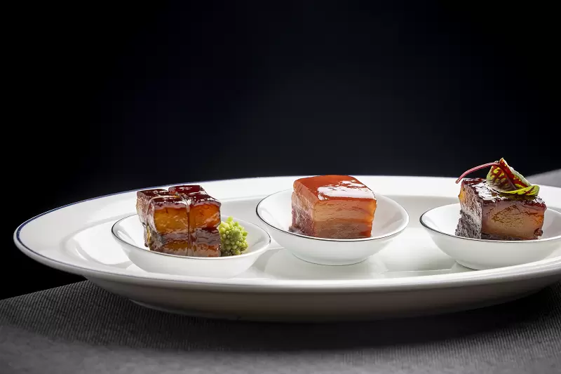 上海苏宁宝丽嘉酒店的行政副总厨张复金,在传统淮扬菜基础上,创新融合多种元素创作了让人眼前一亮的「三味东坡肉」,本道菜品由张师傅和刘仪伟老师联合创作。精选五花肉经过长时间炖煮,再以腐乳、酒酿、香辣豆瓣酱入味,为浓郁、软糯的红烧肉增加了醇香、甜美和鲜辣的丰富层次。苏东坡在《猪肉颂》中以“待他自熟莫催他,火候足时他自美”表达了他朴素的哲学观:尊重客观规律,耐心等待,顺其自然的生活态度。正如这道「三味东坡肉」顺应食材之天然风味,造就锦上添花的精妙之味。