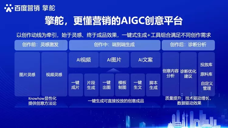作为一款持续进化的自动生产广告创意工具,擎舵不断吸纳市场反馈,数据飞轮越转越快,对用户的理解越来越深,其定位已从原来的“模板式的创意制作工具“升级成为“成长式 AIGC 创意平台”。“以新智生产力激发营销新创意,这无疑是擎舵在广告营销层面最好的价值体现”,百度商业研发AIGC负责人韩聪介绍道,不管是创造前的“灵感激发”,还是创作中的“端到端生成”,或是创作后的“诊断分析”,更懂营销的“擎舵”均能以创作动线为牵引,通过“一键式生成+工具”的组合满足用户不同创作需求。