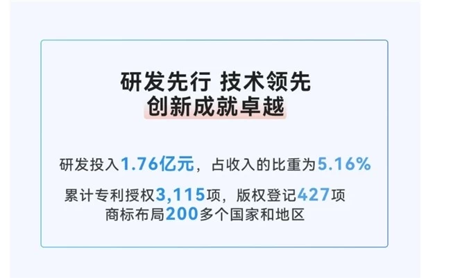 一方面从产品着手,产品是企业发展的根本深挖行业产品痛点,通过技术提供解决方案。2005年洲明科技就率先推出“分立表贴显示屏”,替代当时国内市场上“亚表贴LED产品”。——即,作为洲明科技的第一批产品,就选择了“国内市场空白点”、“行业发展前沿方向”迎难而上!如今,洲明科技累计专利授权3,115项,版权登记427项,商标布局200多个国家和地区,2024年上半年研发投入1.76亿元,占收入的比重为5.16%。在强大的技术加持下,使得洲明科技全部产品自研自产、成本可控,让洲明科技的LED显示屏和相配套的解决方案在国际舞台上更具竞争力。
