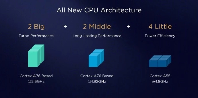 麒麟CPU子系统推出了智能调度机制,创造性地设计了2超大核(基于Cortex-A76开发)、2大核(基于Cortex-A76开发)、4小核(Cortex-A55)的全新能效架构。相对于传统的大小核两档位设计,大中小核能效架构提供了更为精确的调度层次,让CPU在重载、中载、轻载场景下灵活适配,无论使用者是仅在发短信或是边打手游边听歌,麒麟980都能精确调度,大大降低了CPU在实际综合业务场景下的功耗,力求让用户获得更高性能体验的同时获取更长的续航体验。