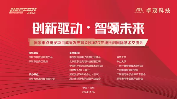 11月6日,卓茂科技将在展馆会议室举办“创新驱动·智领未来:国家重点研发项目成果发布暨X射线3D在线检测国际学术交流会”,邀请清华大学、中国科学院深圳先进技术研究院、京东方、COMET AG(瑞士)、滨松光子学株式会社(日本)等十几家国内外科研院校和行业知名企业,共同探讨X射线3D在线检测技术未来发展趋势。