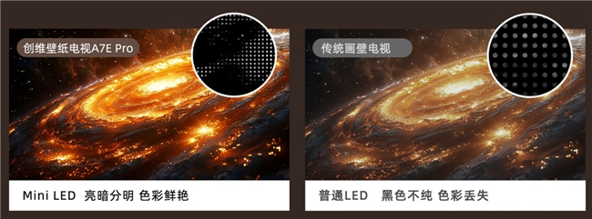 除了外观设计上的别具一格,创维壁纸电视还采用了先进的显示技术和音效系统,使其成为全面的六边形战士。在显示技术方面,创维自研Mini LED全域控光晕技术,通过对发光芯片、透镜、算法、屏幕的全链路光晕控制,解决光晕干扰,控光晕能力提升56.5%。让彩色更绚丽的同时,还能让黑色更纯净,整体画质晶莹剔透。