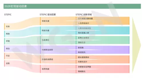 报告指出,未来的驱动力因素与创新领域将从六个维度出发,每个维度下都提出了具体的驱动因素和创新领域,如社会维度的年龄光谱、环境维度的生态责任等。这些因素共同描绘了未来社会发展趋势和创新方向,为相关领域的研究和实践提供了参考方向。
