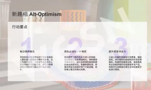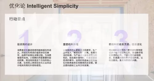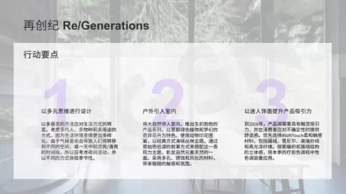 此外,根据三大趋势,报告也指出未来在各趋势下的行动要点。再创纪趋势聚焦于自然元素与可持续设计的和谐融合,强调了环保和健康的重要性,预示着家居设计将更加注重与自然的共生关系。新趣相趋势关注个性化和多元化的设计方向,激发了人们对美好生活的向往和创新思维的发挥。优化论趋势以简约智能的产品设计为主,突出了功能性和用户体验的优先性,通过运用科技使日常生活更加便捷和舒适。
