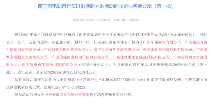 近日,南宁市电动自行车以旧换新补贴活动第一批回收企业名单公示落下帷幕。南宁市商务局的公告如同一盏明灯,照亮了电动自行车产业发展的新方向。在入围的10家企业中,人民出行旗下的南宁逸电再生资源回收有限公司脱颖而出,成为南宁市电动自行车以旧换新补贴活动第一批回收企业名单,这一成果不仅是人民出行在行业发展中的重要里程碑,更是其成功构建旗下产业闭环,深入贯彻落实中央和自治区以旧换新战略的有力见证。