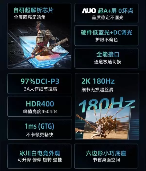 其他功能方面,大圣G5 Pro采用硬件低蓝光护眼加DC调光的双重防护,不偏色的同时,从源头达成护眼。2K 180Hz高刷新率屏、1ms GTG疾速响应;全能接口满血连接,各通道接口信号均支持快速切换,让玩家尽情畅享丝滑游戏体验。