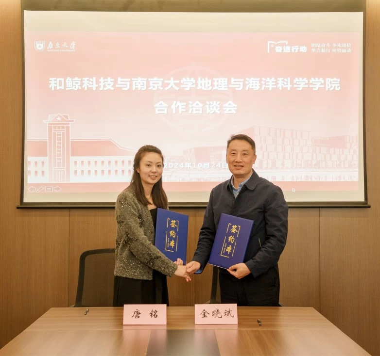 2024 年 10 月 24 日,上海和今信息科技有限公司(以下简称“和鲸科技”)同南京大学地理与海洋科学学院召开合作洽谈会,会上,和鲸科技社区合伙人唐铭与南京大学地理与海洋科学学院副院长金晓斌正式签署和鲸“101 数智领航计划”,旨在就人工智能素质培养展开更多战略合作和交流。南京大学图书馆馆长黄贤金教授、和鲸科技 101 生态运营总监刘宇杰以及人才培养项目负责人吴舒旻等一同出席。