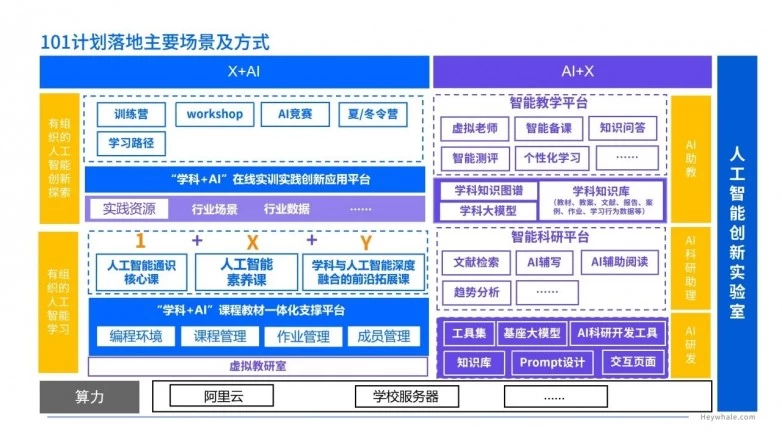 和鲸科技在人工智能与数据科学领域深耕多年,参与了数百所高校交叉学科的建设,并于 2024 年 5 月全新发起“101 数智领航计划”,整合和鲸社区近十年积累的多学科实践资源、ModelWhale 教研训一体化平台和智谱 AI 大模型,打造 AI 创新虚拟实验室,帮助高校解决“学科+人工智能”的落地难题,培养创新型高质量人才,推动创新成果产出。