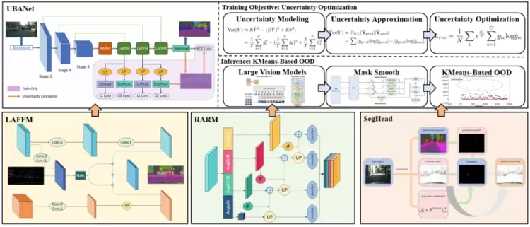 为了有效识别出异常类别,同时能够提高模型的泛化能力,研究团队提出了基于不确定度度量学习的图像语义分割方法UBANet,通过对模型预测的不确定度进行建模和函数近似,从而优化模型预测的不确定度,提高模型对于已知类别和未知类别的区分度,进一步增强模型的泛化能力。