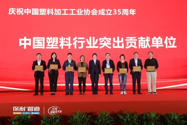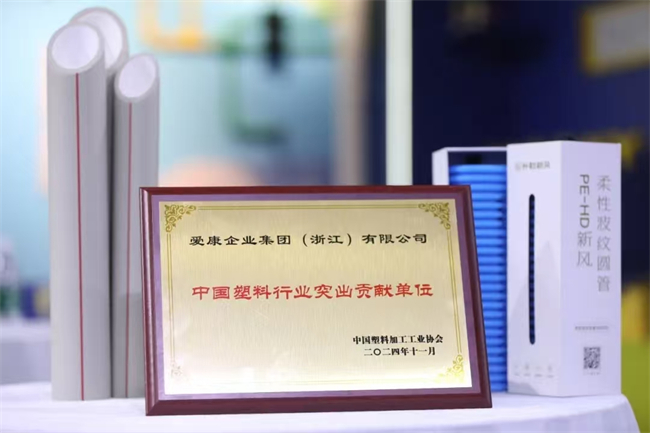 展会期间,在同步进行的第四届中国塑料行业科技大会暨中国塑料加工行业35年发展报告发布会活动中,爱康企业集团(浙江)有限公司荣获“中国塑料行业突出贡献单位”奖。