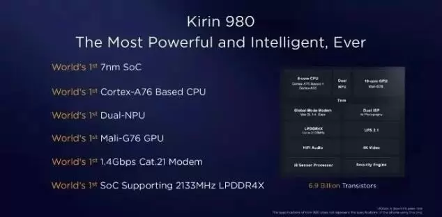 据介绍,麒麟980具备更优秀的性能、能效、智慧和通信能力。作为麒麟新一代顶级人工智能手机芯片,麒麟980在制程工艺、运算性能等各方面都有了突破性的进步,并成为全球首款采用7nm制程工艺的手机芯片,成功在指甲盖大小的尺寸上塞进69亿个晶体管,实现了性能与能效的全面提升。
