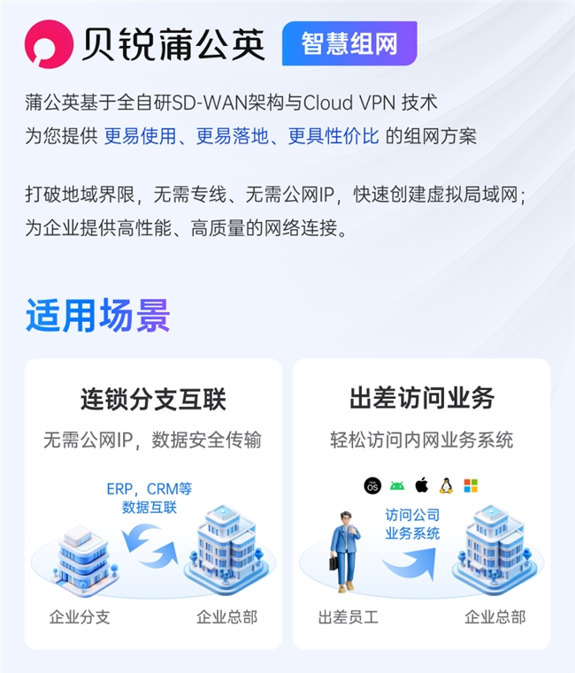 贝锐蒲公英组网方案坚持自主研发,基于自研的SD-WAN技术,不仅跨越了地理限制,实现了全球员工、门店、设备与数据中心及云应用的安全互联,还简化了远程运维流程,降低了分支机构部署的复杂性与专线带宽的高成本。此外,蒲公英方案还能有效解决工业物联网、视频监控的统一管理、数据互通难题,助力企业打造融合解决方案,提供高性能、高质量的网络连接方案。