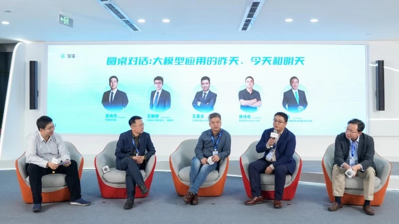 圆桌对话环节,智谱副总裁吴玮杰与北森云计算创始人、董事长王朝晖、泛微网络执行总裁王晨志、思迈特软件CEO姚诗成及联想中国方案服务业务群高级总监顾旭光,围绕“大模型应用的昨天、今天和明天”为主题进行深入探讨。