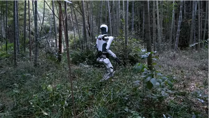 云深处DR01人形机器人在户外跨越复杂地形