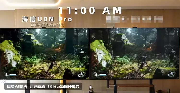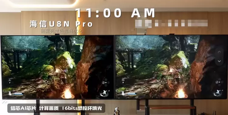 而针对PC游戏这类高动态、高光影效果的画面,两者的画质也能看出区别。比如在《黑神话:悟空》的游戏场景对比中,竞品S的画面明暗、色彩对比度都挺好,只是缺乏一定的景深和层次感;海信电视U8则能够通过超画质Mini LED芯片的优化处理,呈现出丰富的色彩层次,从飞沙走石到水波粼粼,每一个场景都充满了视觉冲击力。