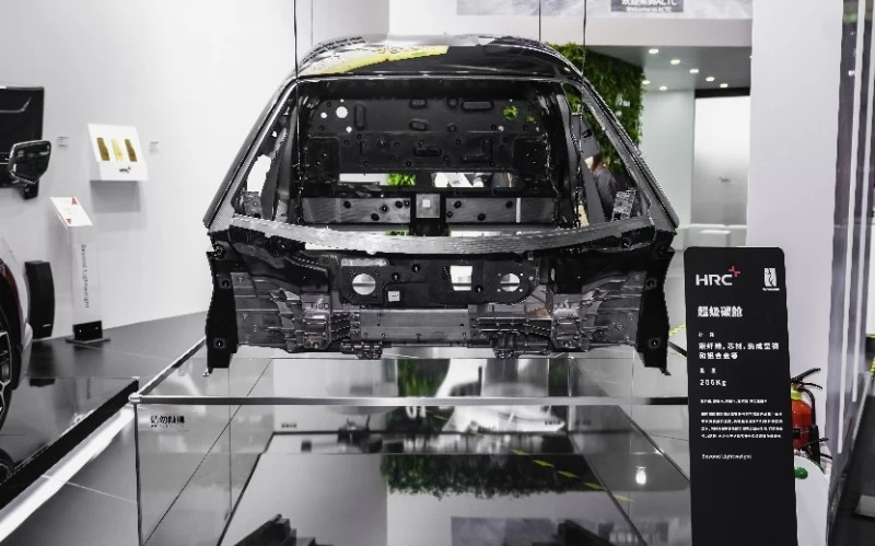 “超级碳舱”是仰望U9所搭载的“碳纤维超安全车身架构”中的核心技术,由HRC协助开发并独家承制,从碳纤维原材料选型推荐、碳纤维零件结构设计与仿真到试制与量产,HRC团队参与了开发的全过程。“超级碳舱”大量运用了T700级12K高性能宇航级碳纤维,占车身体积近80%。通过采用“超级碳舱”,实现了较钢铝方案减重30%的效果,轻量化系数更是突破行业极限,仅为0.95。此外,车身的主要传力路径方面,通过将碳纤维材料与热成形钢融合设计,极大程度提高了车身乘员舱的抗形变能力,同时提升顶压及侧碰的安全上限。HRC还通过运用胶接、螺接、铆接、MIG、FDS等十余种连接结构,并在关键位置设计PMI嵌件等突破性的技术创新,显著提高了极限工况下的操控性和安全性。在HRC展台,“超级碳舱”采用了独特的吊装形式,与仰望U9相呼应形成“内”与“外”的整体呈现,为现场观众带来了鲜明的视觉震撼。