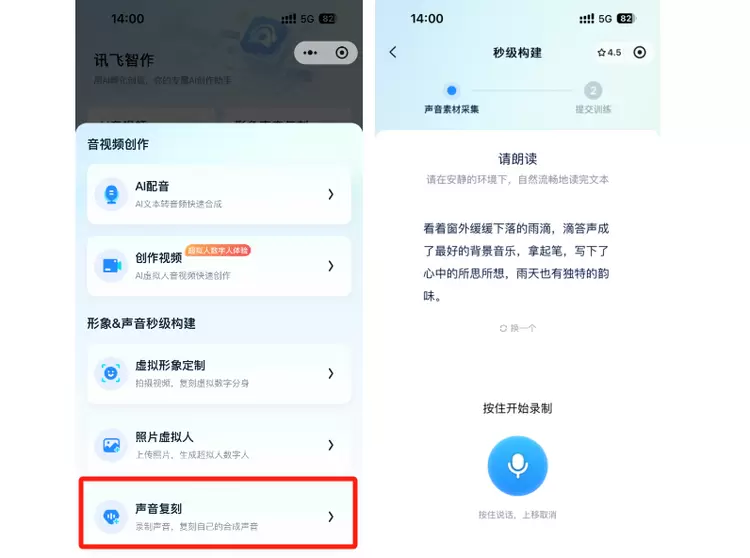 于此同时,超拟人数字人还与此前的「一句话声音复刻」功能做了有机结合。借助大模型语音合成技术,用户在定制专属的超拟人数字人声音时仅需根据提示朗读文本,讯飞智作便会快速学习你的音色、韵律以及说话习惯,短短几秒钟便能复刻出其高质量的专属音频。不仅如此,讯飞智作还实现了跨语种复刻的能力。