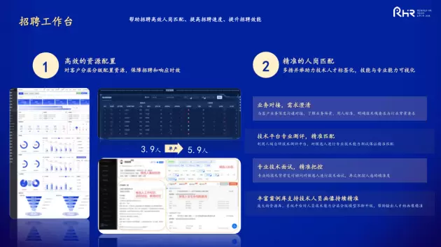 通过招聘工作台的构建,人瑞人才从人力资源服务和管理的角度进入了精准化招聘的时代。一是通过对客户分层、分级配置资源保障交付和响应时效,实现了更加高效的资源配置;二是通过AI等技术应用,多措并举助力技术人才标签化,技能与专业能力可视化,实现了更加精准的人岗匹配,提高了招聘效能。在系统的加持下,人瑞人才的招聘人效高于行业均值50%以上。
