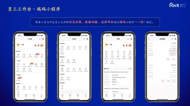 外包员工的工作平台实现了外包员工入职材料的实时收集、实名认证、电子合同在线签署等。通过瑞码小程序,人瑞人才分布在全国各地上百个城市、数万名外包员工的考勤、请休假、加班、调休、报销以及日常证明的开具、转正、离职等流程的在线申请,还有商保在线理赔、薪酬实时查询等等日常事务,都可以通过这个小程序一码搞定,极大地节省了人力成本。