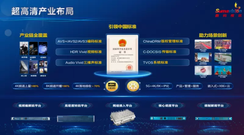 数码视讯(股票代码:300079)在科研层面坚持技术引领、自主可控,在视频核心算法上拥有二十余年技术积累,掌握自主研发的AVS2/AVS3系列超高清视频算法库,已具备4K/8K采集、核心传输交换、存储、编转码等全产业链解决方案,实现超高清视频产业生态闭环,全国4K节目上星参与率100%、全国8K节目开播参与率100%。