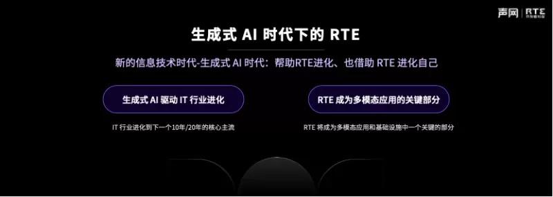 以上四个趋势定义了下个时代 IT 进化的主题,也将成为 IT 进化的核心驱动力。在这样的时代背景下,我们认为生成式 AI 将会一如既往地助力 RTE 能力的进化与普及,同时生成式 AI 也将借助 RTE 能力以及 RTE 应用的广度与深度来进化自身。