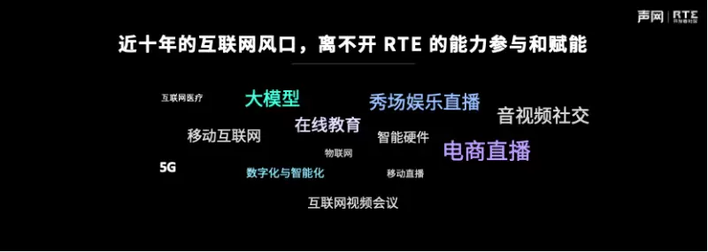 过去十年,大家熟知的互联网风口也有很多离不开RTE能力的赋能和参与。社交泛娱乐、在线教育等行业的创业风口,电商直播对电商行业格局的改变等等,其中很多都和实时互动能力的使用和进化有不可分割的关系。如今,在大模型和生成式 AI 时代,也将伴随 RTE 能力的辅助与赋能走向成熟和应用。