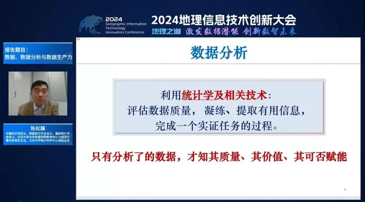 中国科学院院士、美国统计学会会士、国际统计学会会士、北京大学光华管理学院商务统计与经济计量系联席系主任、北京大学统计科学中心创始主任陈松蹊以《数据、数据分析与数据生产力》为题进行了分享。陈院士认为数字化极大的提高了数据采集能力,也提高了数据传输和共享能力。挖掘数据生产力就是数据赋能,除数据平台、计算平台和东数西算等硬件外,还需要通过数据分析进行赋能。陈院士从统计学的角度通过理论高度、技术方法和实践案例应用,阐述了如何从原始的时空数据中挖掘价值数据,从而赋能高质量发展。