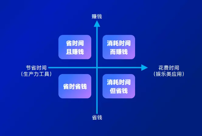 吴畏:我大概有一个理解,把所有AI应用分类在四个象限,横轴是花费时间长短,纵轴是赚钱和省钱。