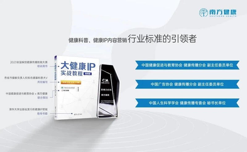 在医药行业数字化转型变革的征程中,南方健康始终坚守初心,引领优质健康科普行业高质量发展。携手中国健康促进与教育协会、各地疾控负责人、全网知名科普大V编写,由清华大学出版社出版了健康IP行业著作《大健康IP实战教程》。通过专业健康IP 多形式、多渠道的健康科普活动,将正确、权威、有趣、有用的科普内容广泛传递给百姓,助力医药企业深度洞察消费者需求,通过内容与消费者直接沟通对话,丰富医药健康产品种类和品质,满足人们多元化的健康需求,帮助大众在面对健康问题时做出多维度“健康决策”,进一步助力医药数字化产业实现再升级,推动整个医药行业迈向更高质量发展。