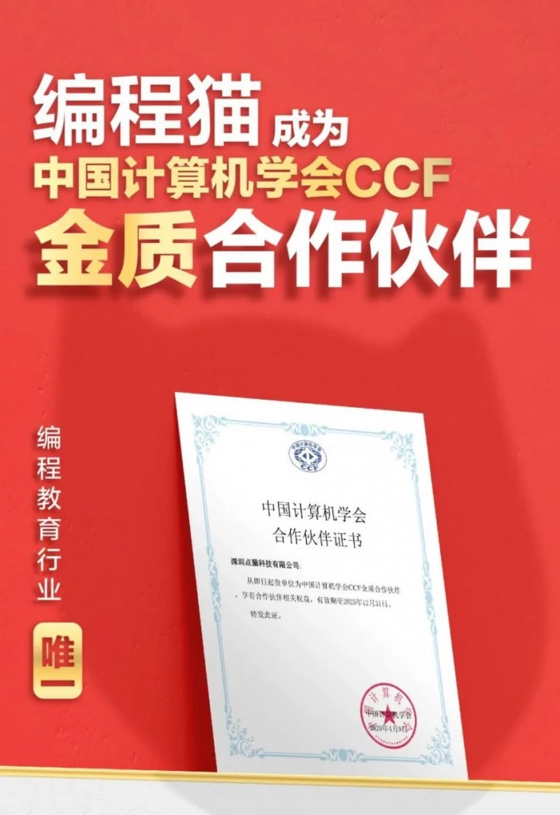 点猫科技与中国计算机学会(CCF)一直保持着长期深远的交流与合作。早在2021年,点猫科技便与中国计算机学会达成战略合作,将国产自研编程软件矩阵接入CCF专业权威平台。今年8月,在深圳南山区教育局和中国计算机学会的指导下,点猫科技参与发起的深圳市南山区“信息学创新人才培养基地”也正式成立。作为编程教育行业内唯一一家与中国计算机学会(CCF)建立金质合作伙伴关系的企业,点猫科技的研发及教研能力备受肯定。