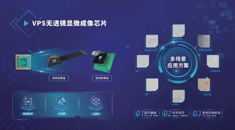 威派视本次获奖产品VPS600超大规模无透镜显微成像芯片(简称“VPS600成像芯片”)是一款应用于生物显微成像领域的图像传感芯片,被称为可以直接“看清”细胞的芯片,该芯片显微成像分辨率500纳米,能够在无需光学透镜放大,无需图像扫描、拼接和数字化过程的情况下,单次拍照瞬间获取全视野高分辨率样本图像,与传统显微镜相比视野扩大500倍,且图像传感芯片只有一元硬币大小,放入现有的医疗仪器中可以大大缩小设备体积。基于VPS600成像芯片开发的医疗成像应用设备已获得医疗器械注册证,并在体外诊断和基因检测等领域取得阶段性进展,未来将面向生物显微、生命科学、大健康等领域为客户提供更优质的成像解决方案。