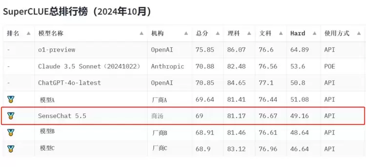 商汤日日新·商量大模型(SenseChat5.5)凭借出色的能力表现,总得分位列国内大模型第一梯队,获得金牌。