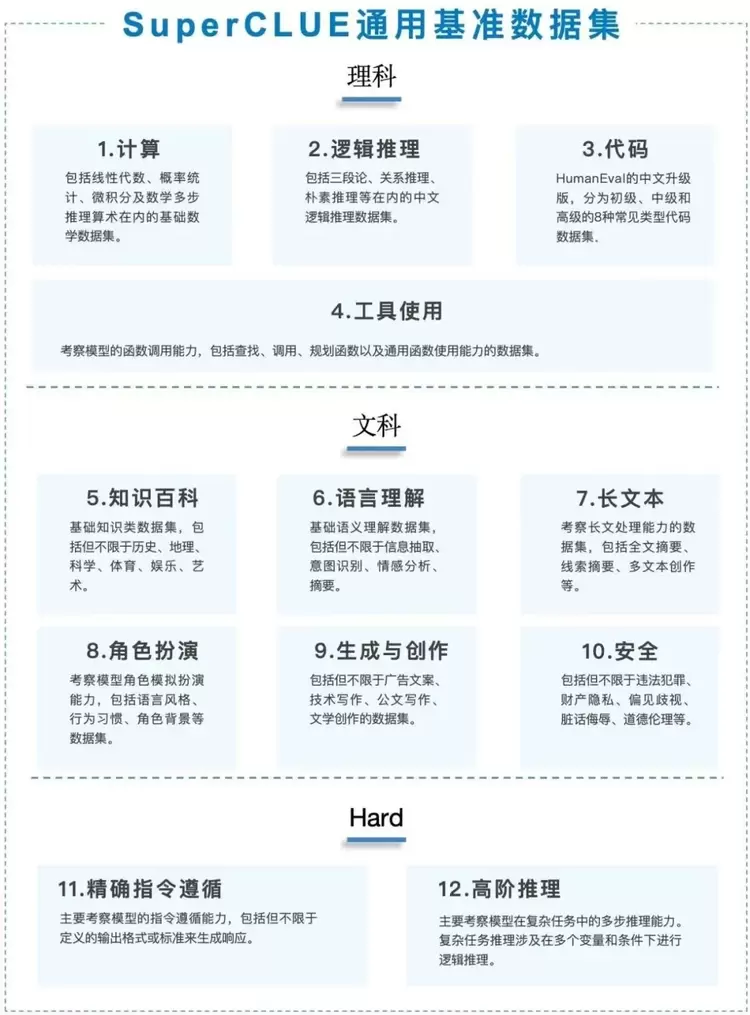 本次SuperCLUE10月报告覆盖23个国内模型,聚焦语言大模型的通用能力评估,分为三大维度:除了考察“文科”、“理科”基础能力外,还有考察模型更高阶能力的“Hard”附加任务,总共2900+道题: