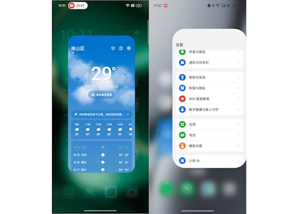 另外应用浮窗这类非常细节的动画效果ColorOS 15也想到了,将应用切换为悬浮小窗时,靠近屏幕边缘,小窗会很自然地缩小成图标,并伴随有震感反馈,再拖出来呢也会放大,并且连续来回拖拽也不成问题。