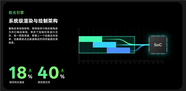 而“极光引擎”是OPPO自研的系统级渲染与绘制架构,深入的是应用上层,也就是用户感知层,通过并行绘制架构实现行业首个可打断并行动画效果,解决用户实际操作中动画卡顿和资源分配不均的问题,该引擎的加持,则使得系统操控的响应速度、稳定程度分别提升了18%和40%。
