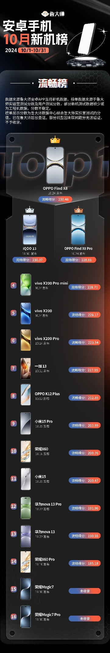 而OPPO Find X8作为10月产出的新旗舰,凭借自研的“潮汐引擎”与“极光引擎”,还有天玑9400强大硬件加持,Find X8以整机230.48的流畅总分占据榜单第一,Find X8 Pro流畅总分也不低,以228.81分位列榜单第三,无不印证了搭载ColorOS 15的Find X8系列强大的流畅实力。
