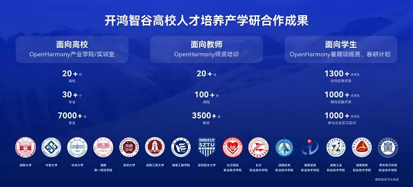 面向高校,开鸿智谷与全国20多所高校共建OpenHarmony产业学院/实训室,覆盖超30个专业、7000多名学生;面向教师,开鸿智谷联合开放原子开源基金会累计开展20+场师资培训,赋能3500多名教师提升OpenHarmony教学能力,助力100多所高校打造OpenHarmony专业师资队伍;面向学生,通过OpenHarmony暑期训练营、春耕计划,针对性培养北向应用开发人才和南向设备开发人才,输送超过1000名学生参与开源企业实习实训。