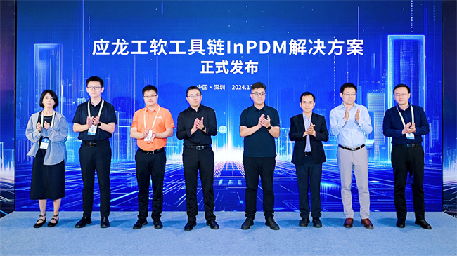 华为云电子云工厂总经理周启航、造物数科副总经理彭文强、泊沧数据CEO张吕权、四平软件董事长吴卫平、悦谱半导体董事长朱光伟、天喻软件副总经理王锐、启云方科技销售总监王刚、蜂巢工软科技总监王亚楠上台发布,创新推出“应龙工软工具链InPDM”。