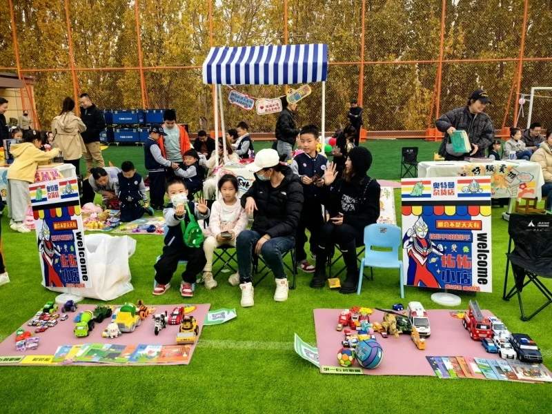 图书市集义卖现场,小朋友为自己的摊位进行了非常有趣的装饰。孩子们将日常闲置书籍、用品拿来售卖或分享,现场更设有“以书换蔬”的趣味分享交换活动,孩子们可以将自己闲置的书籍换取蔬菜,将书籍捐赠给更有需要的人。有的小朋友遇见喜欢的图书,不顾售卖,自顾不暇的翻阅起来,多种多样的图书,激发了孩子们对阅读的喜爱。
