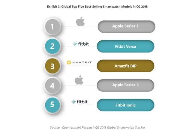 具体到智能手表型号,一代Apple Watch是最畅销的智能手表,占第二季度整体Apple Watch销量的90%以上。第二至第五位排名依次为Fitbit Versa、Amazfit BIP、三代Apple Watch和Fitbit Ionic。