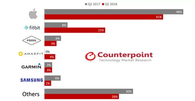 Fossil位居第三,市场分为4%,而上年同期为6%。ZMAZFIT第四,市场份额为4%,而上年同期为0。佳明(Garmin)第五,市场份额为3%,与上年同期持平。三星第六,市场份额2%,而上年同期为6%。