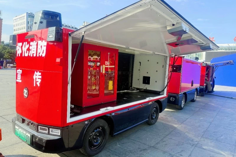 在功能上,九识智能无人驾驶消防宣传车集多种消防宣传手段于一体。它配备了高清显示屏,能够实时播放消防知识视频、火灾案例剖析等内容,从视觉和听觉方面让市民全方位接收与火灾防控有关的知识信息。同时,车辆搭载了语音播报系统,能够在特定区域进行循环播放,提醒市民注意消防安全。此外,宣传车还具备互动功能,市民通过扫描车身上的二维码,就能参与消防知识问答、学习灭火技巧等互动环节,进一步增强了消防安全意识。