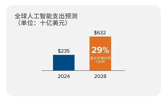 数智时代,技术的边界正在被不断突破。AIGC的应用如火如荼,将重塑生产方式和组织关系。各行业积极挖掘AIGC与自身业务相结合的应用场景,在市场营销与销售、客服服务、内容创作等领域上爆发出活力与想象力。IDC预测,到2028年全球在人工智能的支出将增加一倍以上,预计达到6320亿美元,生成式人工智能技术Gen AI将被更多产品整合其中,这使得全球AI支2024-2028年的复合增长率达到29%。