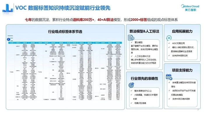 VOC 平台能力支撑全域标签标注一体化运营,经过七年的数据沉淀,累积行业特点语料库超过200万,40多个AI算法模型,形成2000多个标签组成的观点标签体系,从人群、场景、产品角度分析三者相关性,细化用户需求并找到产品创新点。从用户口碑中提炼用户的优化建议,为产品企划找到改善与升级的方向。