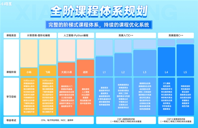 在成立初期,小码王即汇聚了国内科技教育界的顶尖专家、长江学者及信息学奥林匹克竞赛的钻石级教练,共同组建了少儿编程行业内首个教育研究机构——小码研究院。这一举措不仅开创了先河,更奠定了行业内的标准课程体系,即Scratch—Python—C++这一被广泛采纳的教学路径。步入2023年,小码王再次引领潮流,对全线课程进行了4.0版本的全面革新。依托自主研发的ACGO学习平台,我们对Scratch、Python、C++课程进行了深度挖掘与优化,精心构建了全场景互动式课堂,无缝融合学习、练习、测试与评估四大环节。此外,课程还紧密对接多项考级内容与重点白名单赛事,为孩子们提供了更为丰富、高效且贴近实战的学习体验。