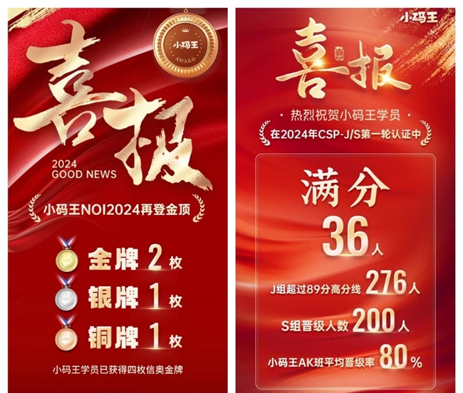 多年来,小码王持续为全国青少年信息学奥林匹克竞赛(NOI)、全国青少年信息学奥林匹克联赛(NOIP)、CSP-J/S等众多信息学顶级赛事输送了大量人才和高分选手。在连续两年NOI竞赛中,在连续两年的NOI竞赛中,小码王学员夺得四金、三银、两铜的傲人成绩。在今年的CSP-J/S认证中,小码王学员也展现出了非凡实力。此外,在教育部白名单中的各项科技类赛事,以及全国各地的科学赛事活动中,小码王的学员们同样以卓越的表现,彰显了他们在编程领域的过人实力。